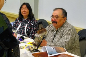 The conference opened Friday with registration check-in with time to visit the Marketplace where there were three separate tables set up. Eliot Waldman (Native Art Traders) had a wonderful selection of Inuit art. Tony Weyiouanna, Sr., had a varied selection of arts and crafts that he and his wife brought with them from Shishmaref, Alaska. And Sheila Romalis had a few items she was selling from her brother’s estate as well as materials promoting her upcoming trip to east Greenland in the summer of 2014.